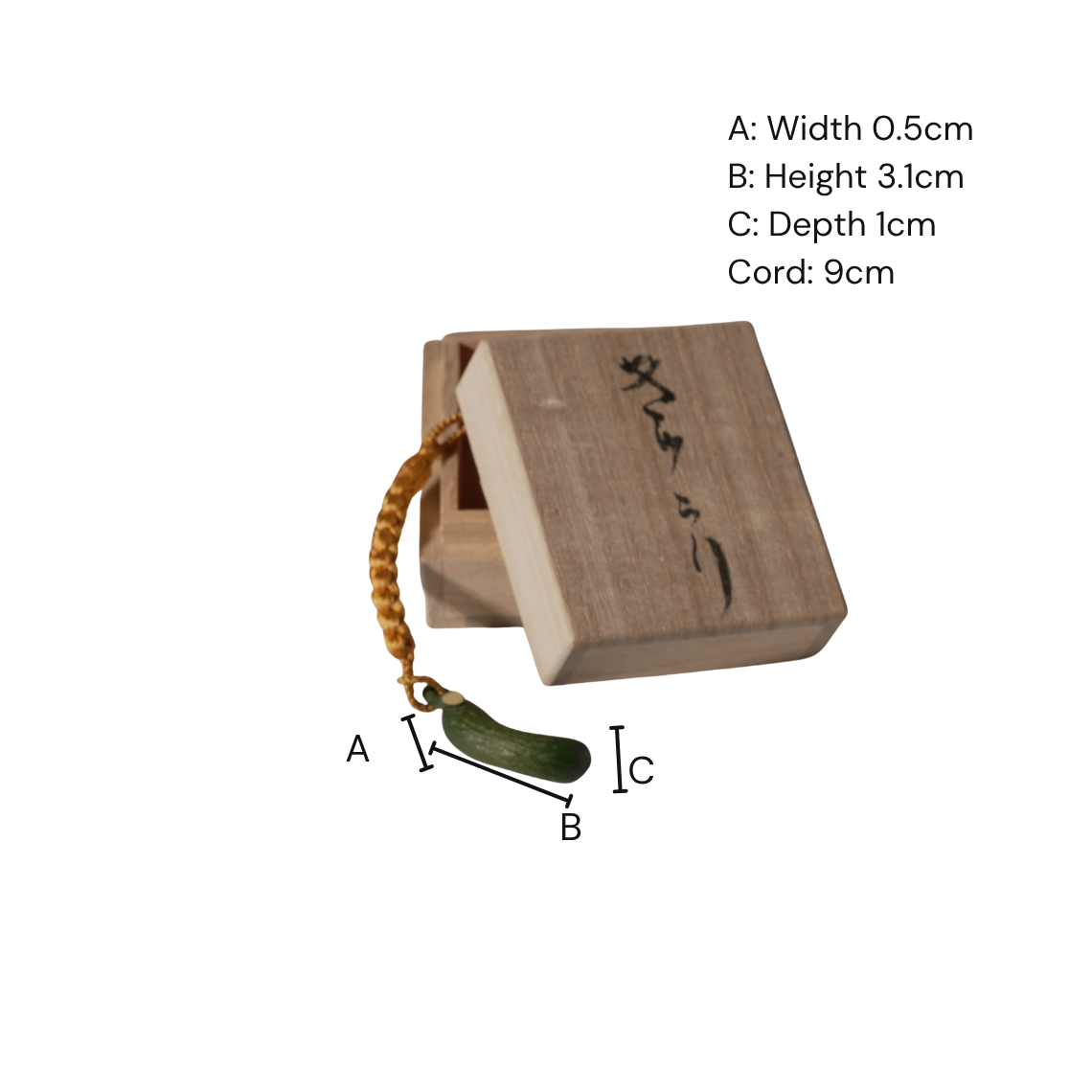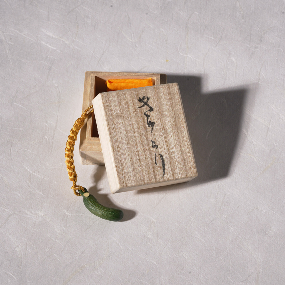 This netsuke, crafted from boxwood and lacquer, depicts a cucumber with delicate realism and rich texture. Netsuke, historically used to fasten items to a kimono’s sash, are today treasured as refined, collectible works of Japanese miniature art.