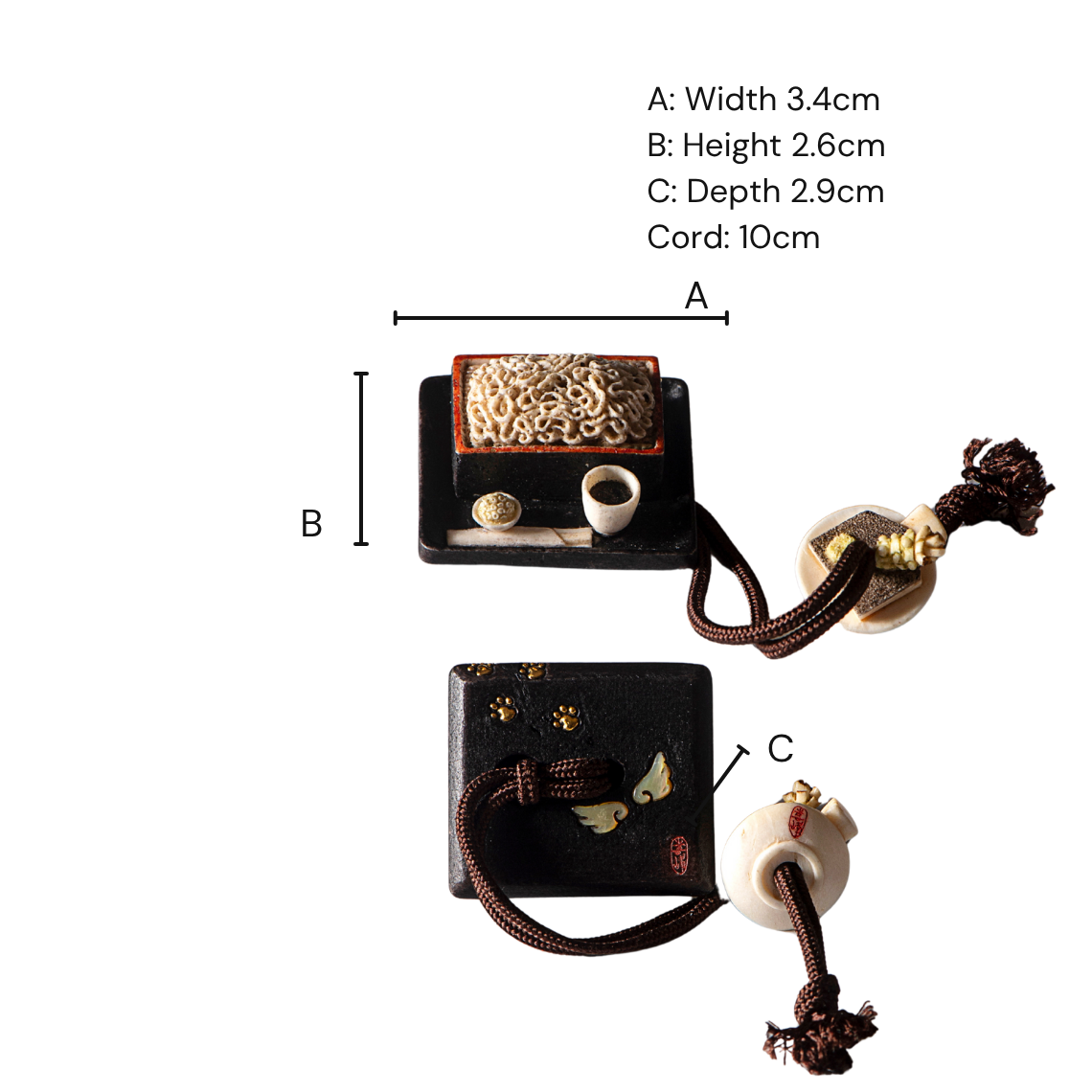 Born in Kagawa Prefecture in 1957, he originally worked as a jewelry and metalcraft artisan before turning to netsuke carving in 1992. Drawing on the techniques and expertise he developed in jewelry making, he freely combines new materials and metals, excelling in highly detailed inlay work. He has also established a distinctive style based on wordplay and associative imagery, actively incorporating wit and humor into his pieces to delight the viewer.
