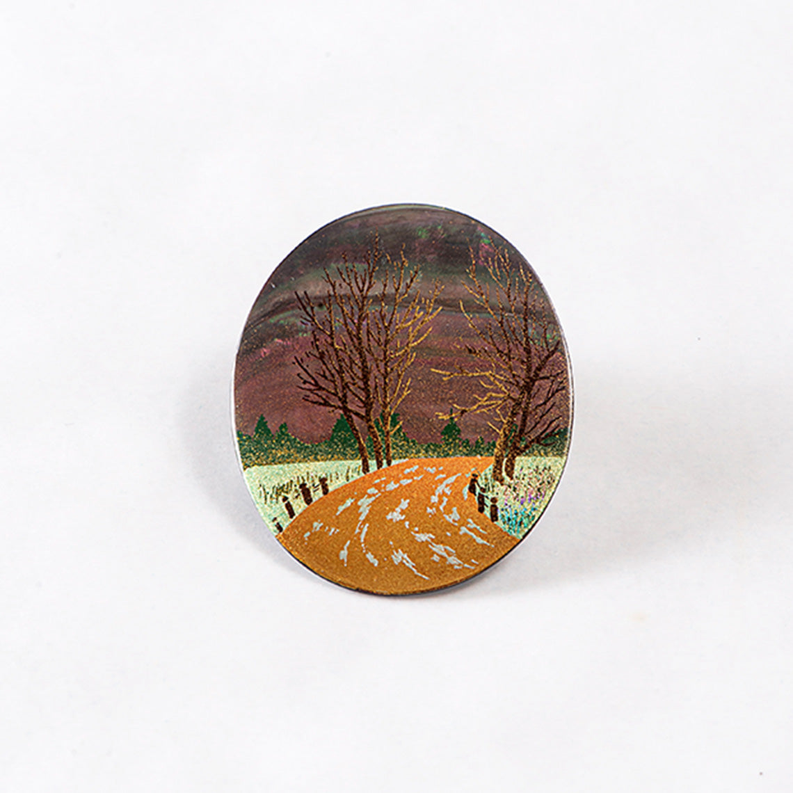 A quiet road beneath leafless trees and a moody sky is rendered with serene refinement in Modern Makie. This artistry merges traditional Makie techniques with modern innovation, creating new lacquer crafts with mother of South Sea Pearl.
