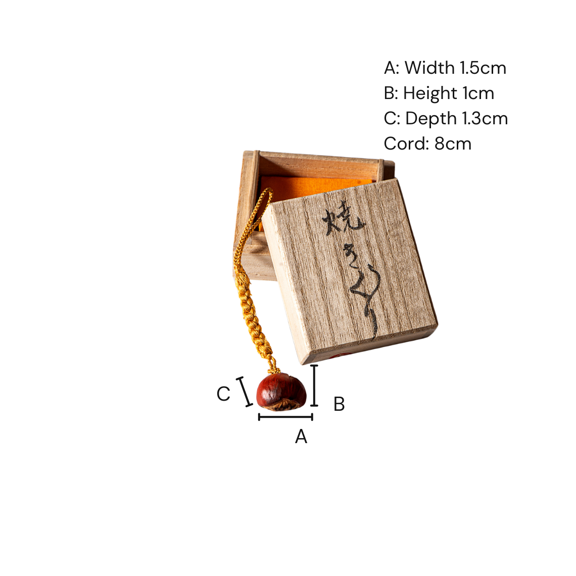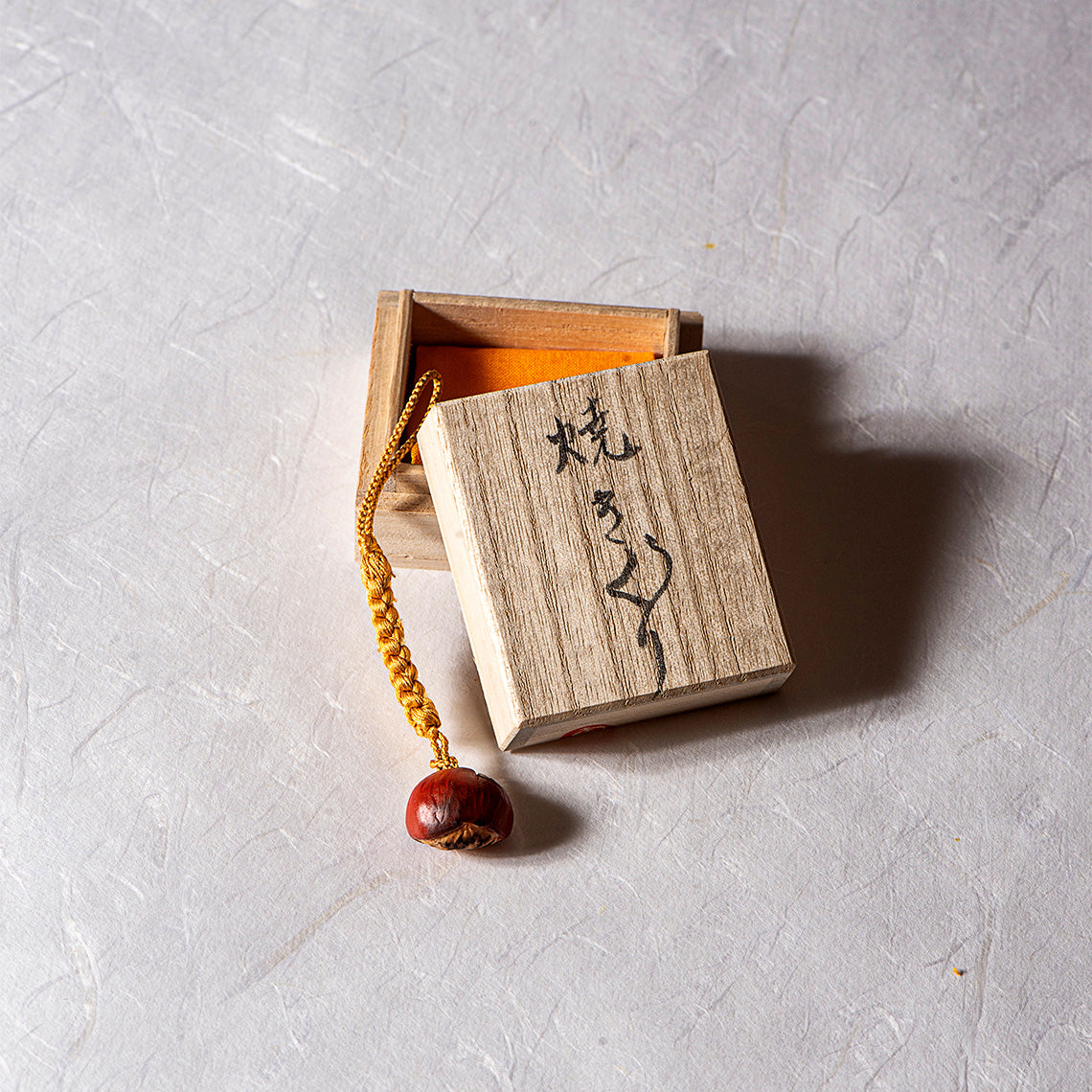 This netsuke, crafted from boxwood with lacquer highlights, renders roasted chestnuts in exquisite detail. Netsuke are traditional Japanese carvings once used to fasten objects to a kimono’s sash, now admired as luxurious, collectible works of miniature art.