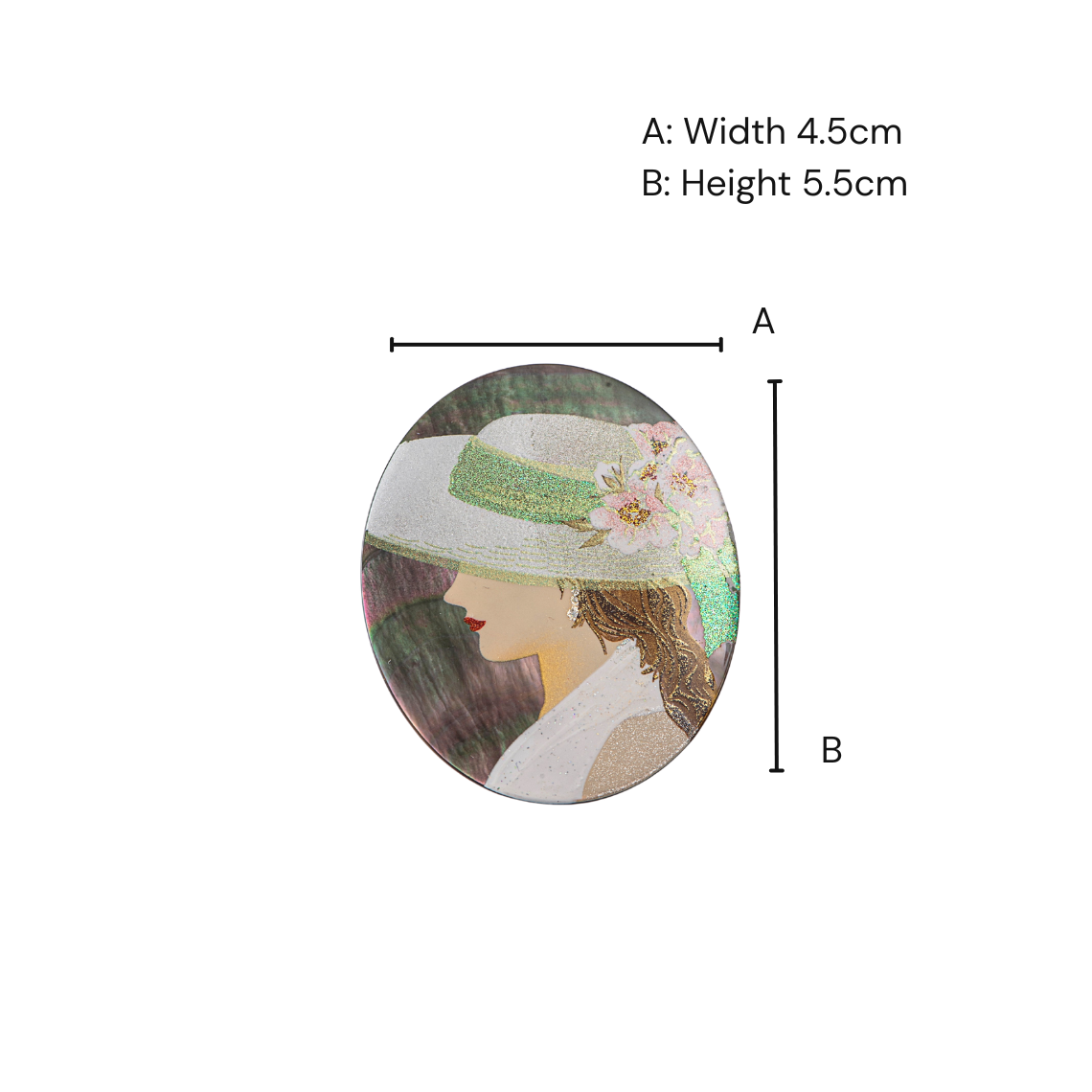 The elegant silhouette of a lady in a flowered hat, her lips gently highlighted, is rendered with sophistication in Modern Makie. Tradition and modern artistry unite, forming new lacquer crafts with mother of South Sea Pearl.