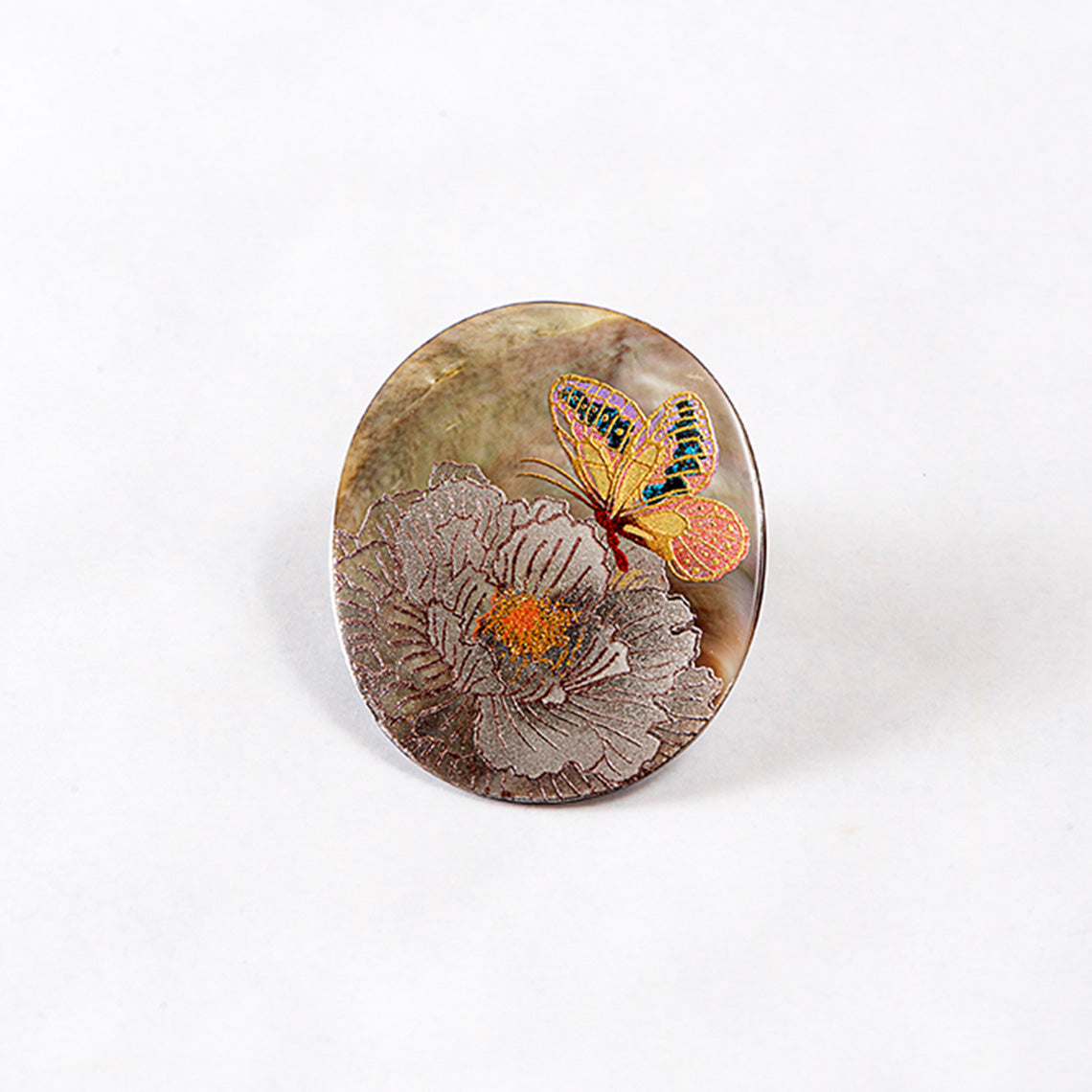 A vibrant butterfly rests on a white flower against a golden background, captured with refined elegance through Modern Makie artistry. The traditional Makie method is now intermingled with modern techniques, creating new artistic lacquer crafts with mother of South Sea Pearl.